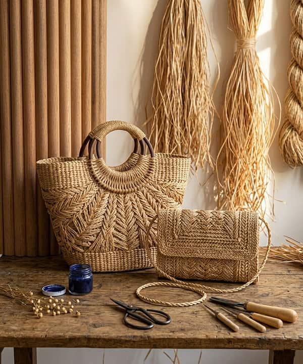Notre choix s’est porté sur le crochet pour mettre le raphia en valeur. Cette technique permet à nos artisanes de créer des motifs originaux.